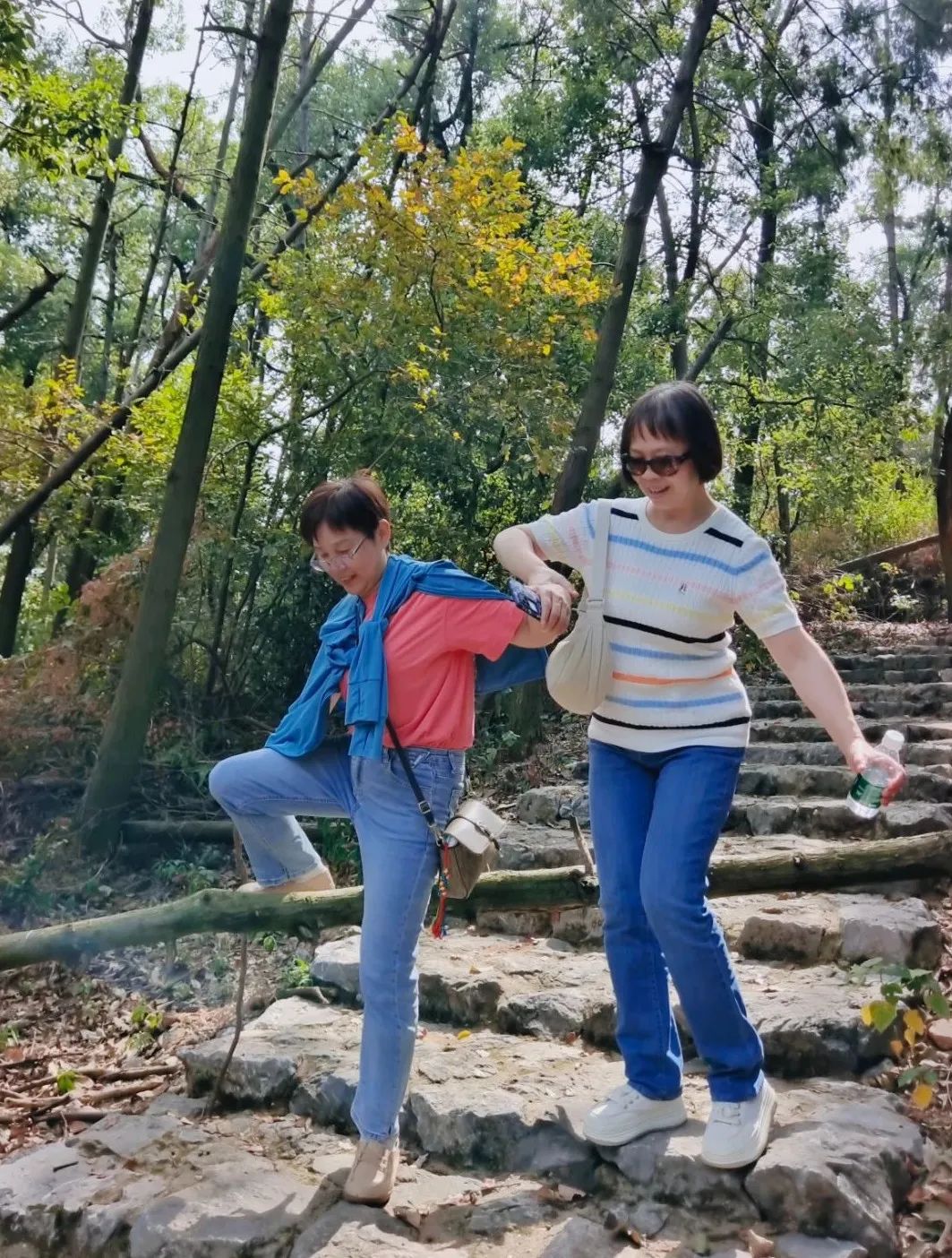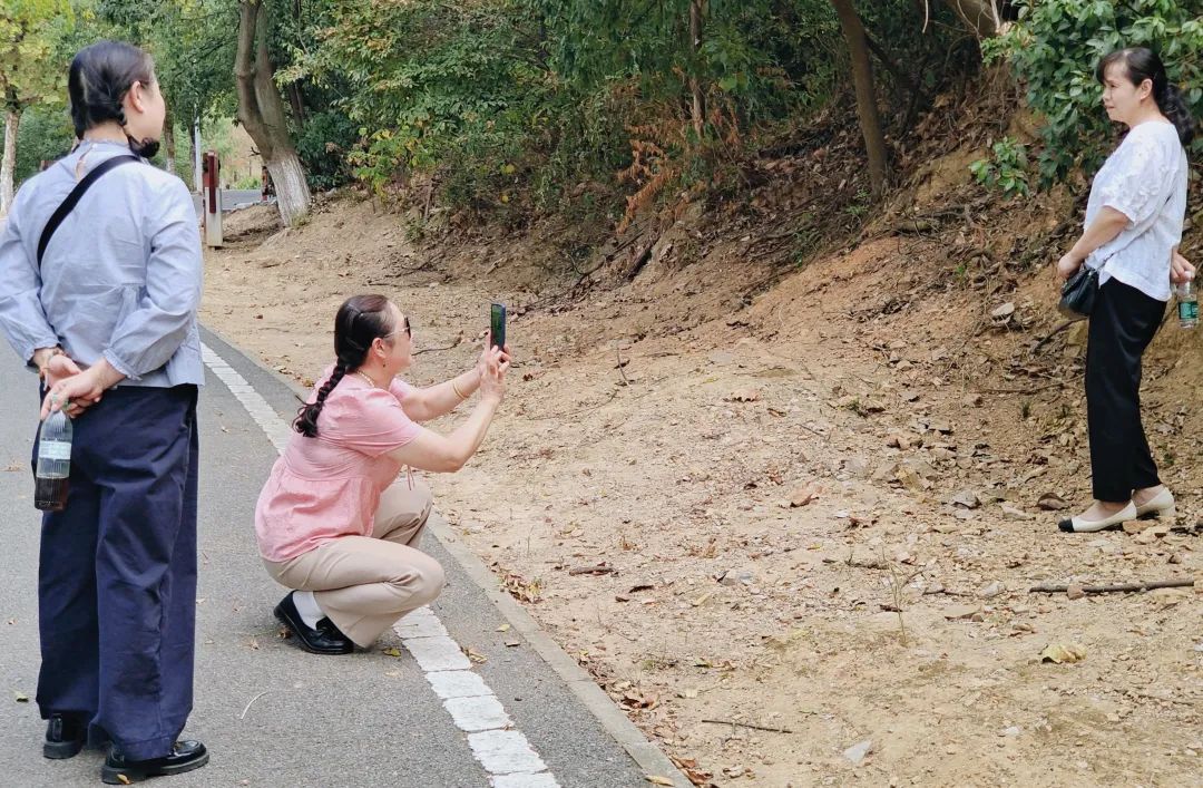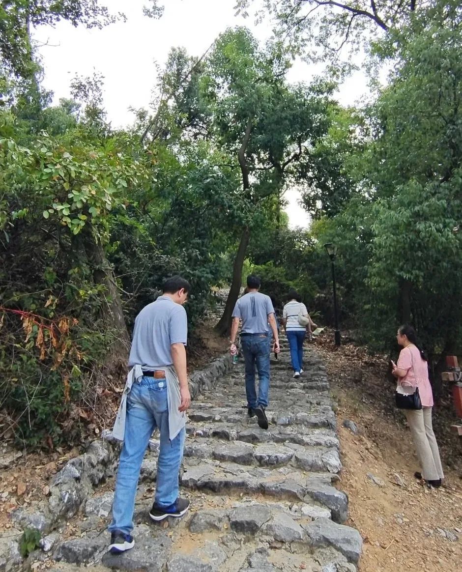 大家首先从北门步入,沿着林间绿道,呼吸着“绿肺”景区清新的空气,一路笑着闹着,来到一处山脚下的上山道口。古有诗云:“今日云景好,水绿秋山明。携壶酌流霞,搴菊泛寒荣。地远松石古,风扬弦管清。窥觞照欢颜,独笑还自倾。落帽醉山月,空歌怀友生。”,众人寻着李白的足迹,开始登顶之旅。