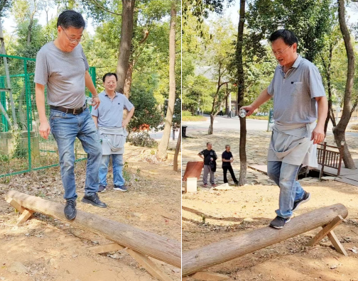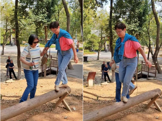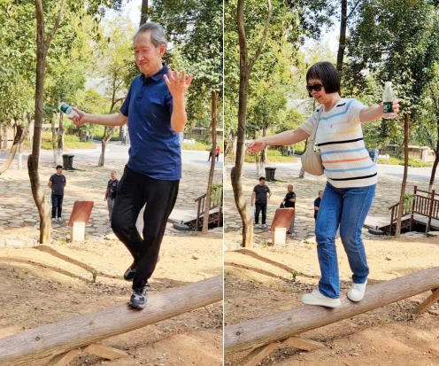 童心之旅:九曲湾旁,一个主题乐园吸引了大家的目光,抬头望望,空中走钢丝难度有点大,果断放弃!前方一根原木,离地不高,众人集体决定来一场平衡力大赛:走原木。