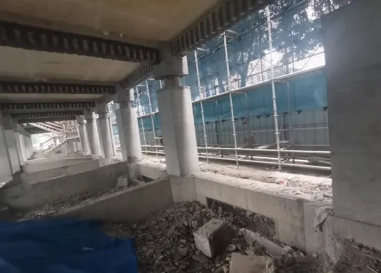 12月7日上午,参会人员到“成都七中林荫校区学科融合中心改建工程”现场观摩交流。本工程为原有建筑贴临市政道路而建,距离道路边线仅2米左右,若采用拆除后新建方式,临街建筑需满足退道路红线8米的距离要求,没有足够空间新建同等规模的建筑,因此只能在原有建筑基础上进行改建。