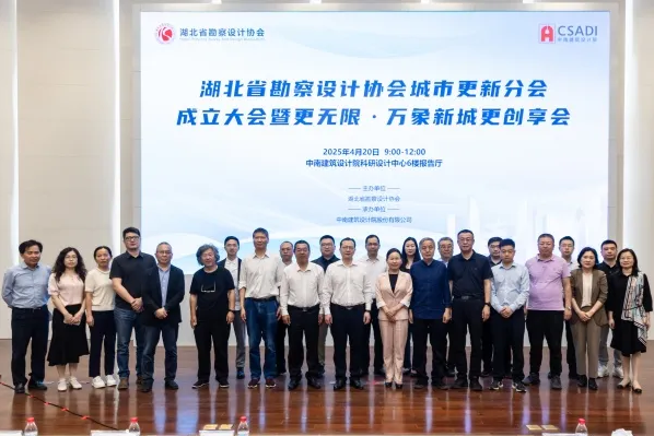 2025年4月20日,湖北省勘察设计协会城市更新分会成立大会暨更无限·万象新城更创享会在中南建筑设计院举行。 湖北省住房和城乡建设厅建筑市场监管处处长唐先国致辞,湖北省勘察设计协会会长,中南建院党委书记、董事长杨剑华出席会议并致辞,中南建院党委副书记、总经理尹勤旺,党委委员、副总经理胡曙海出席会议,中南建院首席总建筑师(执行)李春舫主持主题演讲活动。湖北省勘察设计协会副会长兼秘书长刘炳清,行业专家及47家分会会员单位代表参会。 中南建院当选为首届会长单位,中信院、一冶集团、湖北省规划院、武汉市政院、武汉园林院、武勘协咨询等单位当选为副会长单位;中南院胡曙海当选为城市更新分会长。