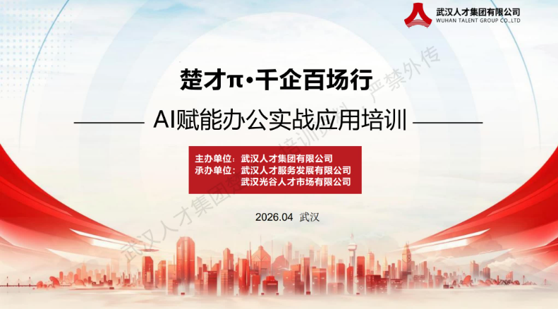 2026年4月2日下午,我部财务与综合办公室(以下简称”综合办公室“)派员参加在武汉人力资源服务产业园举办的《AI 赋能高效办公实战培训活动》。本次活动由武汉人才集团主办、由武汉人才服务发展有限公司和武汉光谷人才市场有限公司承办,是市级最高规格的人事管理、办公业务培训指导活动之一。