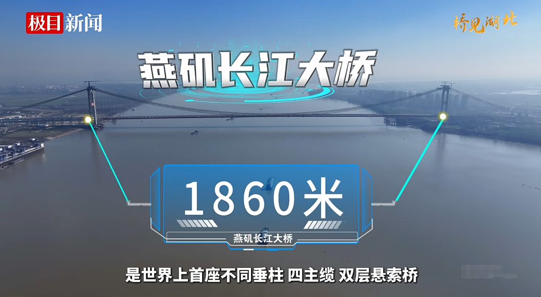 燕矶长江大桥由湖北交通投资集团有限公司投资建设,中铁大桥局与中交二航局承建。大桥横跨鄂州黄冈两地,采用一跨过江的方式,主跨1860米,是目前中国跨度排名第三的长江大桥,同时也是世界最大跨径的四主缆悬索桥。项目全长约26千米,上层为六车道高速公路,设计时速100公里,下层为四车道城市快速路,设计时速80公里,是一座集高等级公路与城市快速路于一体的多功能、复合型过江通道。