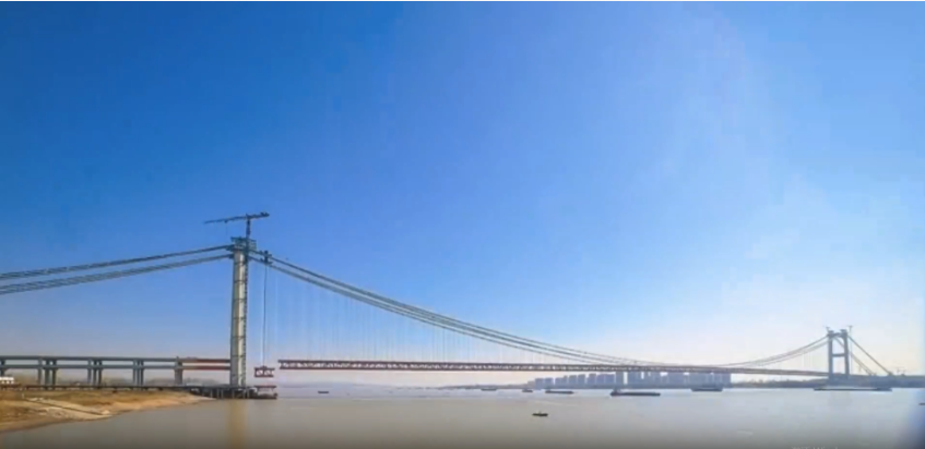 尤为值得关注的是,这座大桥距离鄂州花湖国际机场仅5公里,面临着“上有飞机限高、下有轮船通航”的多重制约。受航空限高影响,大桥主塔高度仅184米,垂跨比达到了千米级悬索桥中前所未有的1:15。在塔高受限、航道需求、生态红线以及桥位地质条件等多重约束下,项目团队创新性地设计出了世界首座不同垂度四主缆双层钢桁梁悬索桥。全桥主缆总拉力需达28万吨,四条主缆高低错落、分承荷载,不仅解决了受力问题,更为桥梁的安全稳定性提供了有力保障。