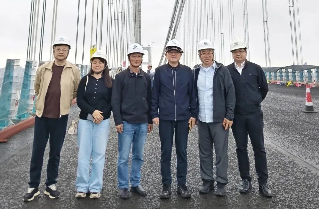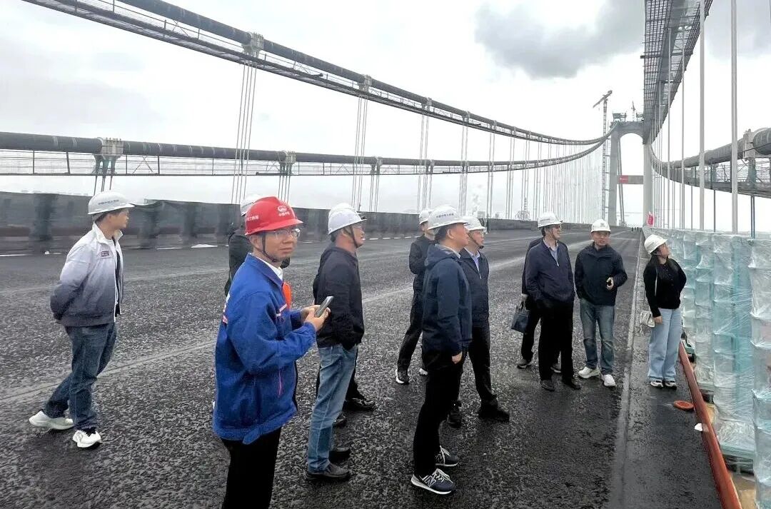 座谈结束后,全体参会人员驱车前往施工已近收尾的燕矶长江大桥主桥面,进行实地步行踏勘。高耸入云的主塔如巨人矗立,四条主悬索如巨龙腾江,气势磅礴、令人震撼。现场对栏杆、缘石的包裹保护和施工工序的细致安排,体现了工程建设团队对环保理念和高品质目标的不懈追求。大家在江风拂面的大桥上流连观摩、驻足交流,纷纷感慨于这座世界级桥梁的雄姿与匠心,对建设团队的精湛技艺和严谨态度给予高度赞许,向相关单位和代表表示由衷的致敬!